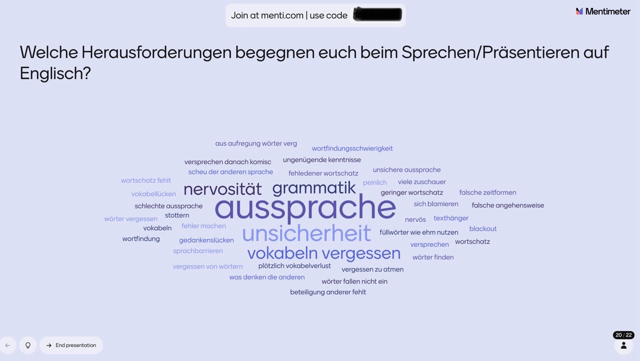 Neben der Arbeit mit Vokabeln im Kontext eines Forschungsartikels stand besonders das Präsentieren auf Englisch im Fokus – mit praktischen Tipps zu Aussprache, Flüssigkeit und Vorbereitung.